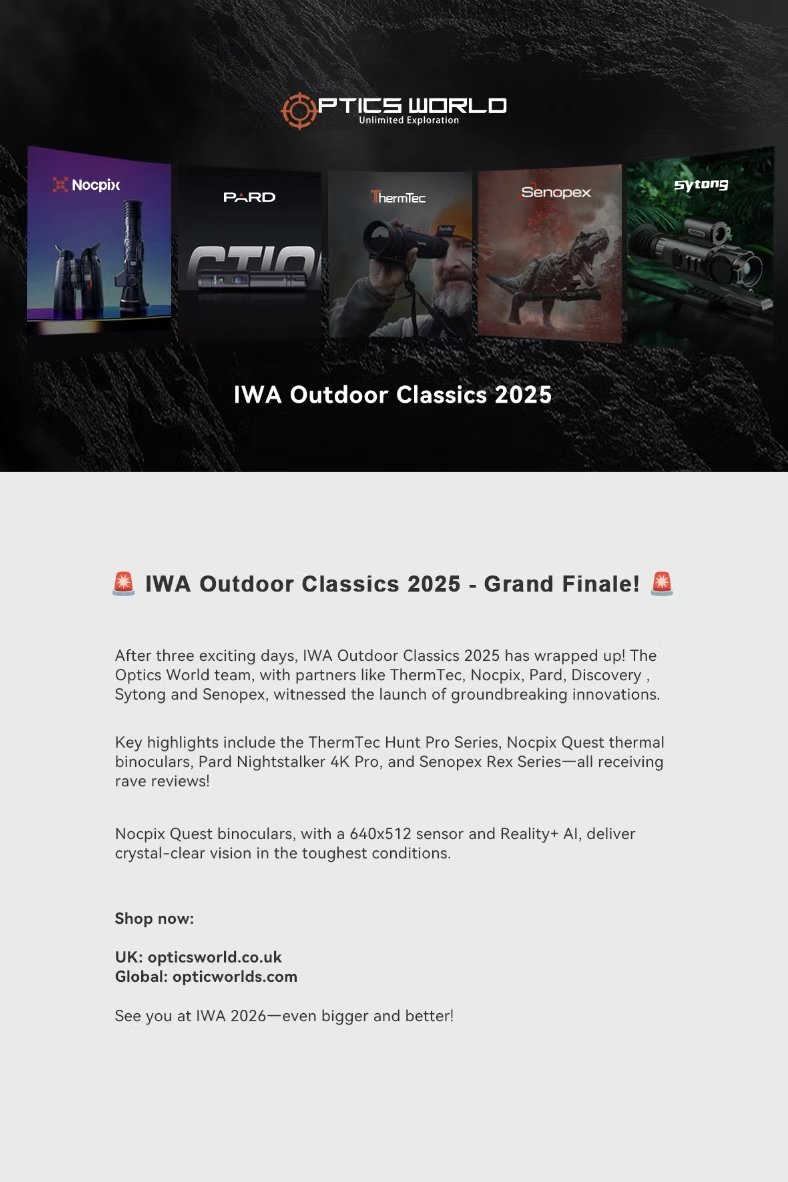 After three action-packed days, the IWA Outdoor Classics 2025 has come to a fantastic close! The Optics World team, alongside our esteemed partners like Pulsar, Hikimicro, Thermtec, Nocpix, Falcon, Pard, Senopex, Discovery, Pixfra, Guide, Delta, Vector Optics, Hawk, Conotech and DNT, had the honor of witnessing the launch of some truly groundbreaking innovations.This year’s highlights included the launch of the Thermtec Hunt Pro Series, the advanced Nocpix Quest thermal binoculars, the impressive Pard Pantera series /Nightstalker 4K Pro, and the cutting-edge Senopex Rex Series. All of these products left a lasting impression, receiving outstanding reviews from attendees and industry experts alike! We are thrilled to bring you these game-changing technologies, specially designed for professional hunters and outdoor enthusiasts. The Nocpix Quest binoculars, featuring a 640×512 sensor and Reality+ AI enhancement, offer crystal-clear vision even in the toughest conditions. Whether you’re hunting, exploring, or simply enjoying the outdoors, our products are here to elevate your experience. Don’t miss out on our exclusive offers! Visit us now to shop our latest gear. For purchases in the UK, visit: https://opticsworlds.com For global customers, visit: https://opticsworlds.com We look forward to seeing you again at IWA 2026—bigger and better than ever before!.