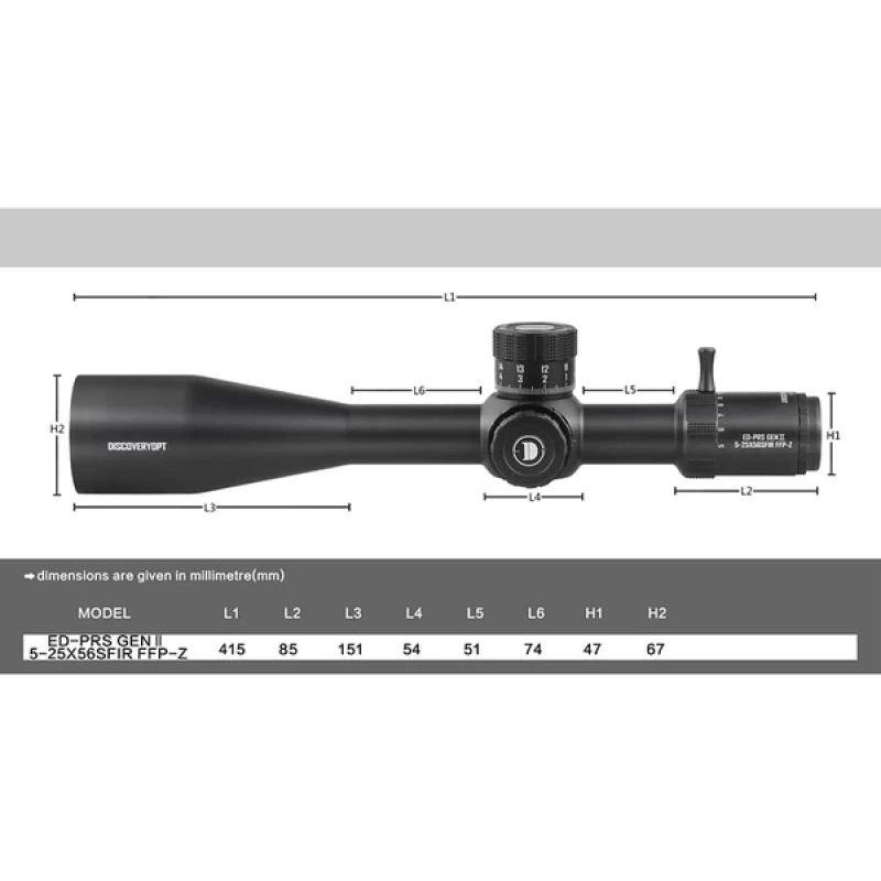 The DISCOVERYOPT EDGENII 5-25X56SFIR Riflescope offers 5-25x magnification for long distances and competitions. DISCOVERYOPT EDGENII 5-25X56SFIR Riflescope features a 34mm tube for maximum turret lift.