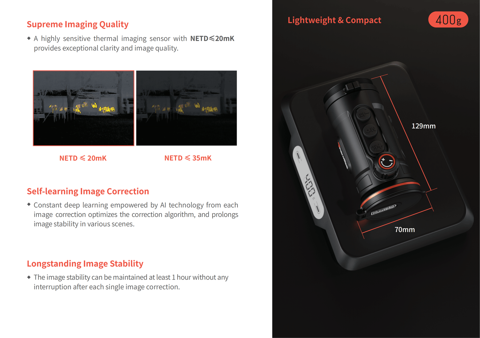 Experience unparalleled clarity and detail with the ThermTec Hunt 335. Its highly sensitive thermal imaging sensor, boasting NETD≤20mK, ensures precision even in the darkest conditions, unveiling hidden game with unmatched clarity.