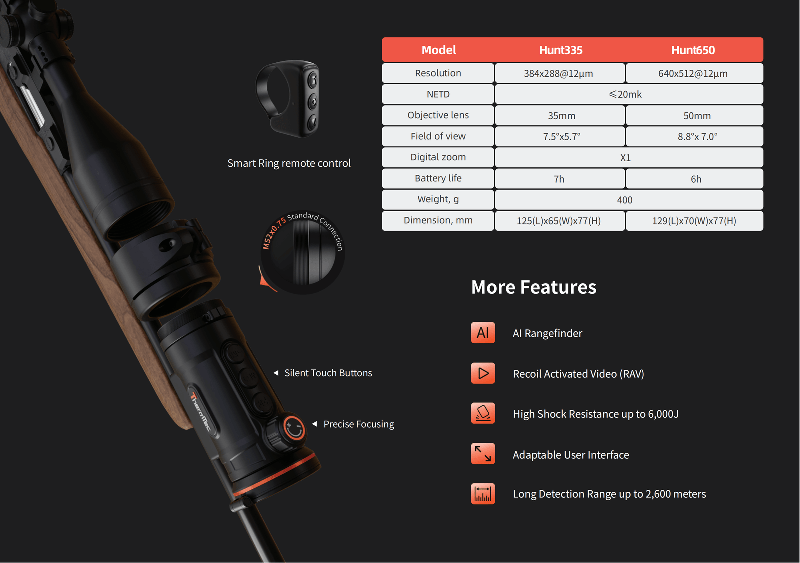ThermTec HUNT 335 Thermal Add On offers an excellent balance of performance and value. ThermTec HUNT 335 Thermal Add On features a sensor with NETD ≤ 20mK and 384×288@12μm, ensuring reliable image clarity in any conditions. With a 35mm lens, it has a detection range of up to 1750m. Weighing just 400g, this lightweight and budget-friendly thermal scope attachment is perfect for hunters who already have a daytime scope and are eager to enhance their hunting experience without breaking the bank.